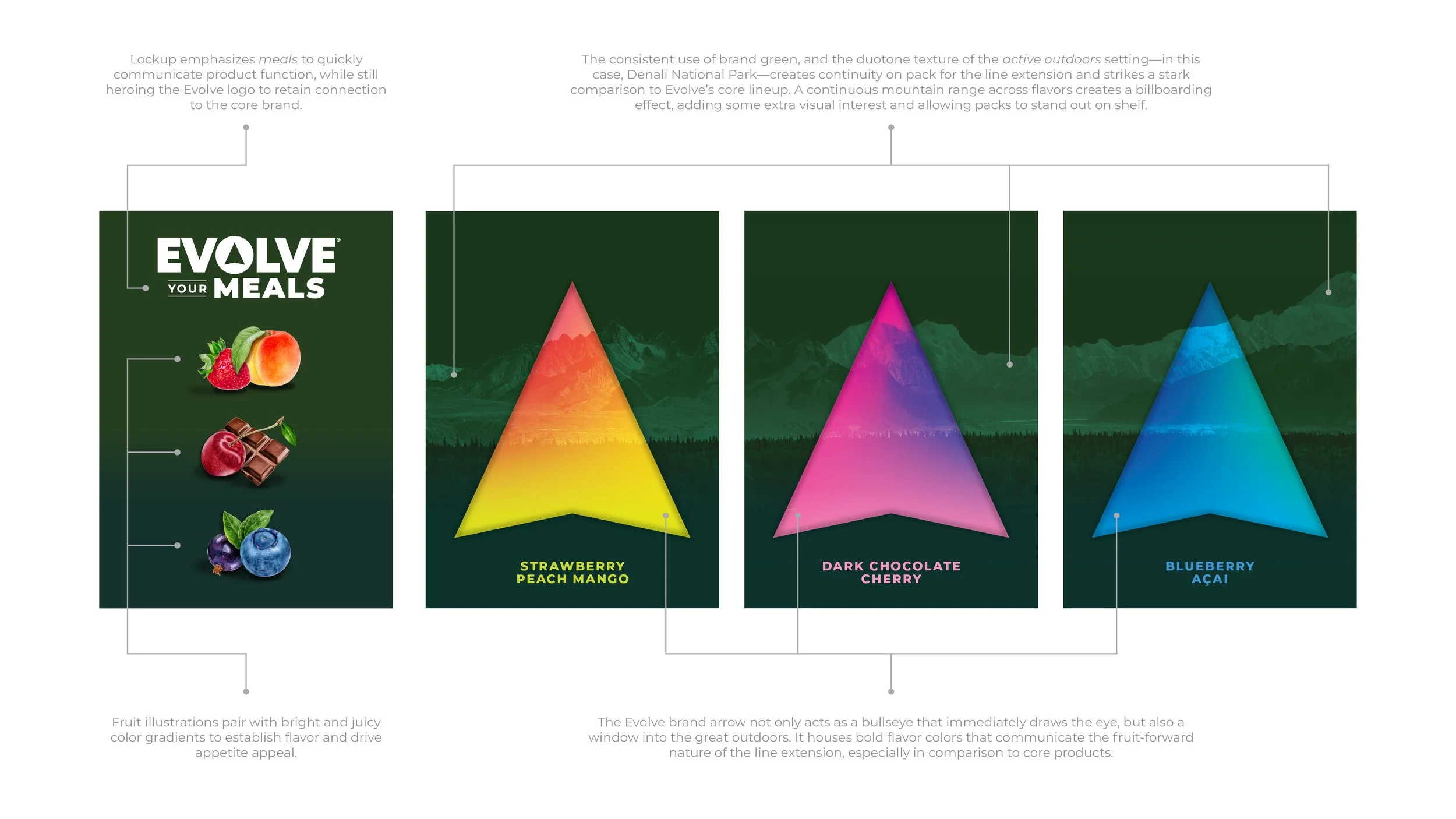 With goals to capture new consumers with this line extension, the client needed a pack design that would breakthrough on shelf and feel visually different from base Evolve offerings, while continuing to infuse the Active Outdoors brand positioning and reinforce key Evolve equity elements from the recent rebrand. In essence, the package design needed to feel distinct from core SKUs while retaining brand resonance and fitting seamlessly within the family of Evolve’s plant-based protein offerings. For these reasons, the client was interested in a moderate to high degree of change from their core design.